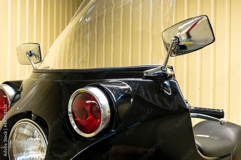 Retro motorcycle with red headlights. Front view