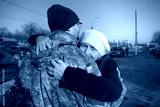 Elderly mother says goodbye to her military son. Mom hugs a Ukrainian soldier. Militarization. Ukrainian defender says goodbye to his family. Mobilization of Ukrainian men. War of Ukraine and Russia