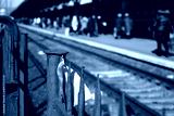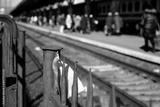 Ukrainian refugees leave Ukraine. Railway stations of Western Ukraine are filled with migrants. Ukrainian Flag on a fence of the station. Humanitarian catastrophe. Refugees got off a train in Uzhhorod