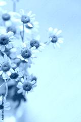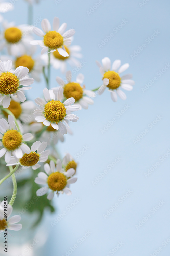 Fresh bouquet of chamomile flowers in a glass vase on the blue background. Close up. Copy space