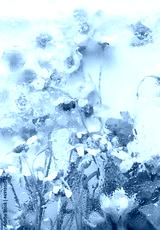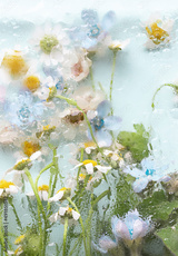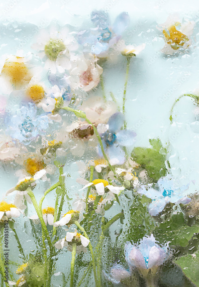Fresh chamomile, tweedia and waxflower flowers behind wet glass. Floral concept macro background