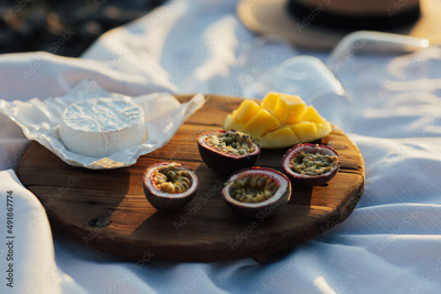 Beautiful summer picnic at sunset with brie cheese, mango and passion fruits.