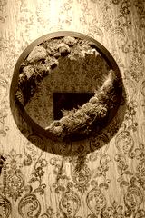 Round mirror in the bedroom. Mirror decorated with eco plants