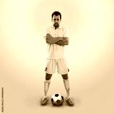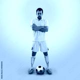 Professional soccer player hitting ball for winning goal in action on gradient multicolored neon background. Concept of sport competition.