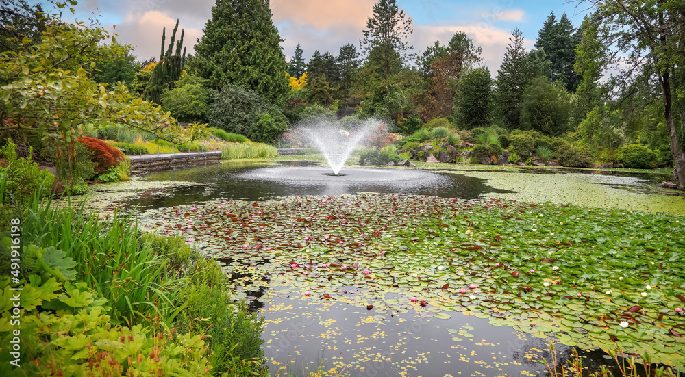 Scenic pond with fountain spraying water in the Vancouver botanical gardens.