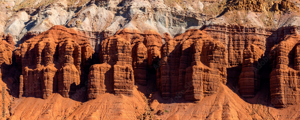 Panoramic view of Red Sandstone rock formation in Capitol reef national park.