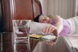 the girl lies in bed and wants to take medicine