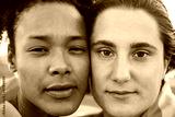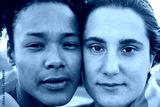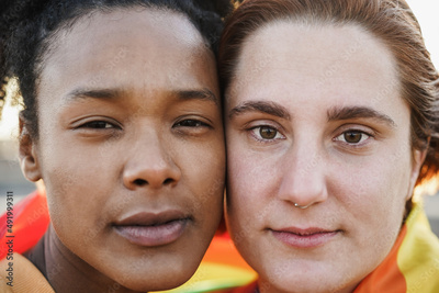 Young women gay couple looking at camera outdoor - Lgbt and love concept - Focus on right girl eyes