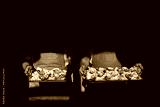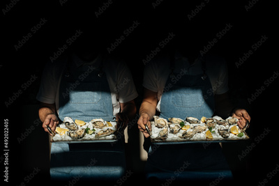 waiter holding a metal tray fresh raw oysters with lime, lemon and ice. raw opened oyster, lifestyle food, ready to eat. Oyster dinner in restaurant