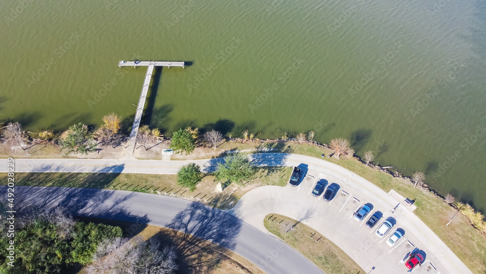 Aerial view lakeside parking lots with parked cars and long fishing dock jetty near Dallas, Texas, America