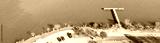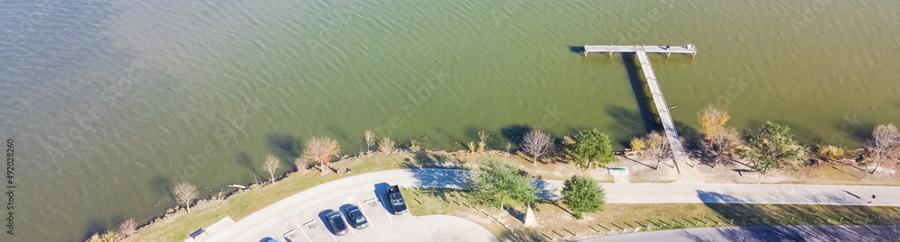 Panoramic aerial view fishing dock jetty with fishermen anglers on White Rock Lake near Dallas downtown in fall afternoon, Texas, USA