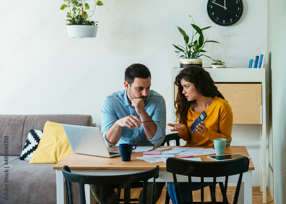 Disappointed wife showing calculator to sad husband while calculating family budget and bills, using laptop computer and drinking cup of coffee.
