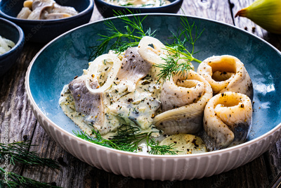 Swedish style marinated herring fillets in mayonnaise and cream with pickled cucumber, parsley, onion, garlic and dill on wooden table