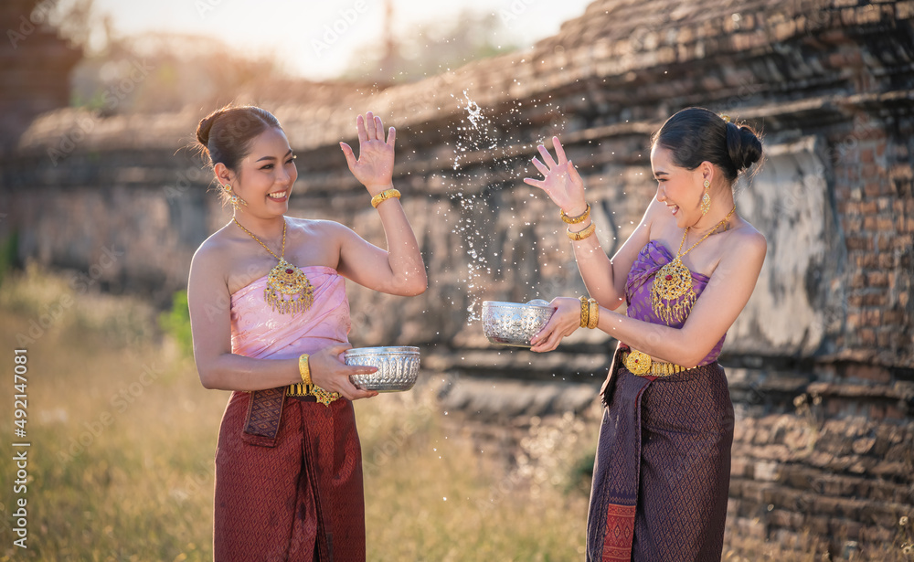 Beautiful Asian woman wearing Thai dress traditional pose happiness to playing splash water during Songkran festival is funny festival traditional holiday in Thailand .