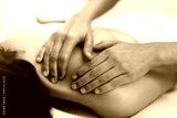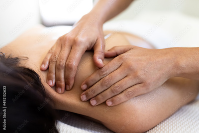 Closeup of woman hands giving a relaxing back massage to female client.