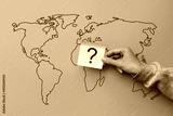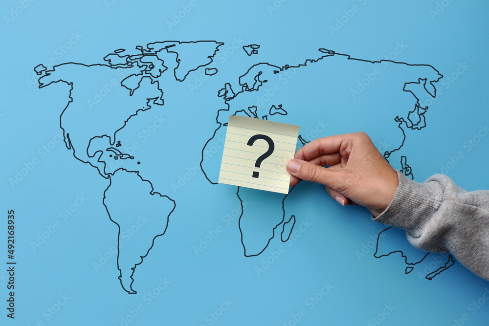 Question mark on the background of the world map. Doubts about the political issue