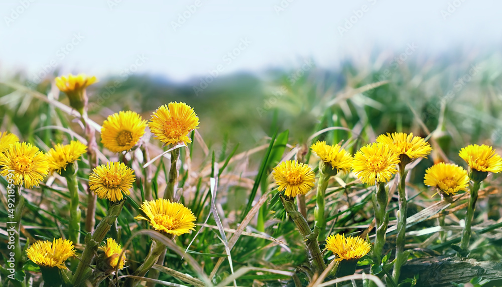 Coltsfoot flowers (Tussilago farfara) close up on meadow, sunny natural background. early spring season. beautiful first spring seasonal yellow coltsfoot flowers
