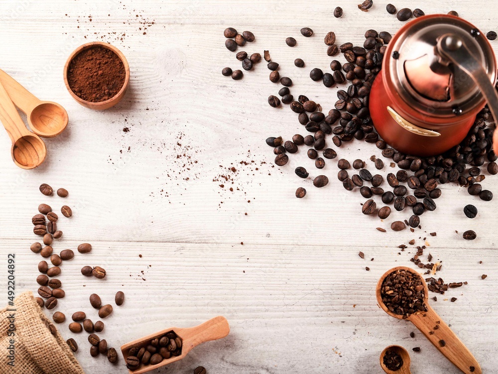 Coffe Bean and Coarse Grinding Coffee, Copy Space for Text on White Wooden Background. Rustic Style Concept