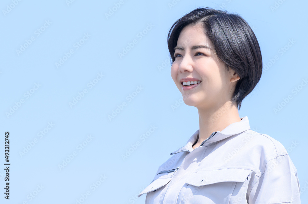 作業着姿で微笑む女性