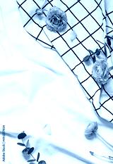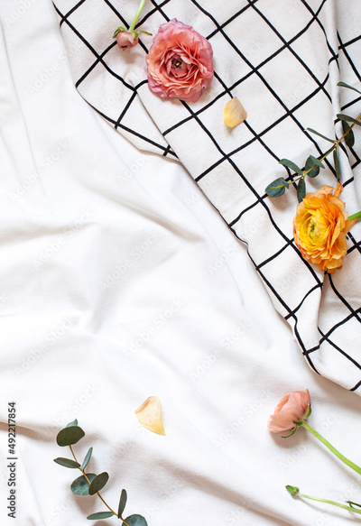 Concept flat lay with flowers and leaves on the white bed sheet. Valentines day, Mothers day or Womens day top view frame. Copy space