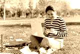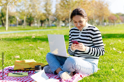 Young woman in casual clothes sitting at park using laptop.