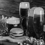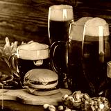 Glass of beer on bar counter. Jugs, mugs, pints of brew beverage, ale, cider on wooden table in pub, bar. Backlit dark showcase with craft beer bottles in brewery. French fries fried potatoes snack