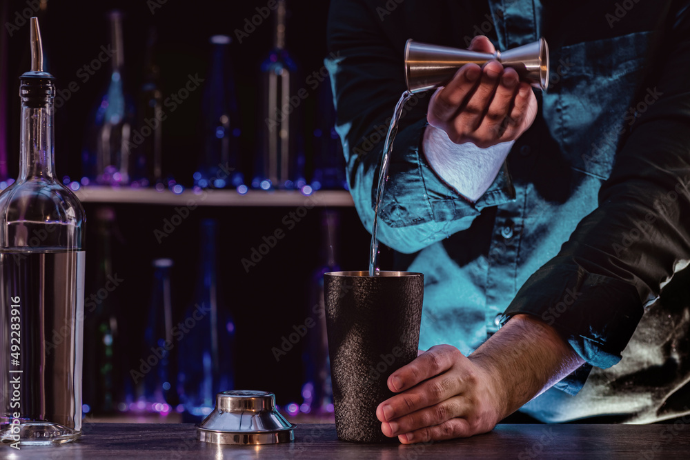 Bartender's hands serving cocktails on bar counter in a restaurant, pub. Mixed drinks. Alcoholic cooler beverage at nightclub on dark background