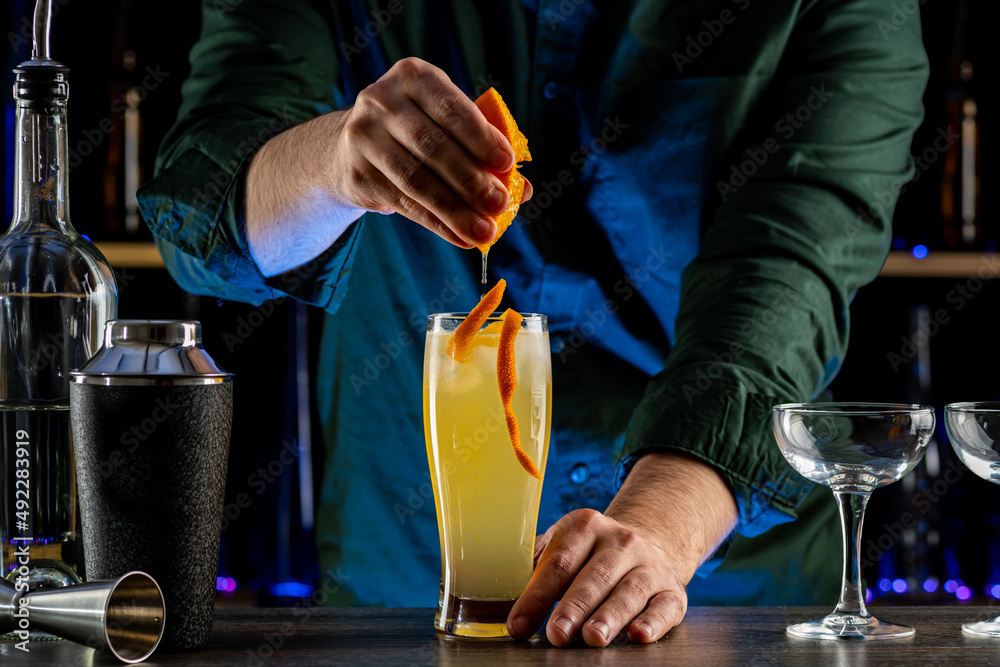 Bartender's hands serving cocktails on bar counter in a restaurant, pub. Mixed drinks. Alcoholic cooler beverage at nightclub on dark background