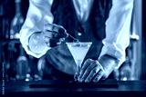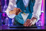 Bartender's hands serving cocktails on bar counter in a restaurant, pub. Mixed drinks. Alcoholic cooler beverage at nightclub on dark background