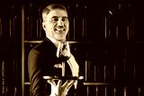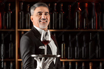 Elegant waiter sommelier wine steward with a glass of wine. Examination of wine products. Restaurant staff among shelves of wine bottles. Stylish middle-aged man with a grey beard