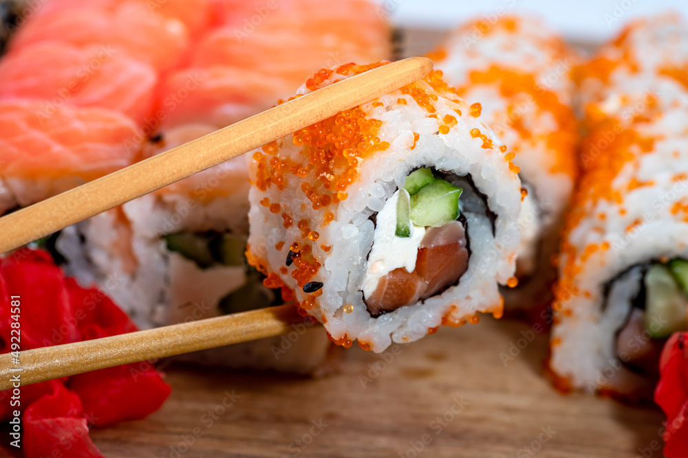 Close view of Sushi rolls in a Japanese restaurant. Appetizer Makizushi delicious traditional food of rice, seafood, avocado, fish salmon