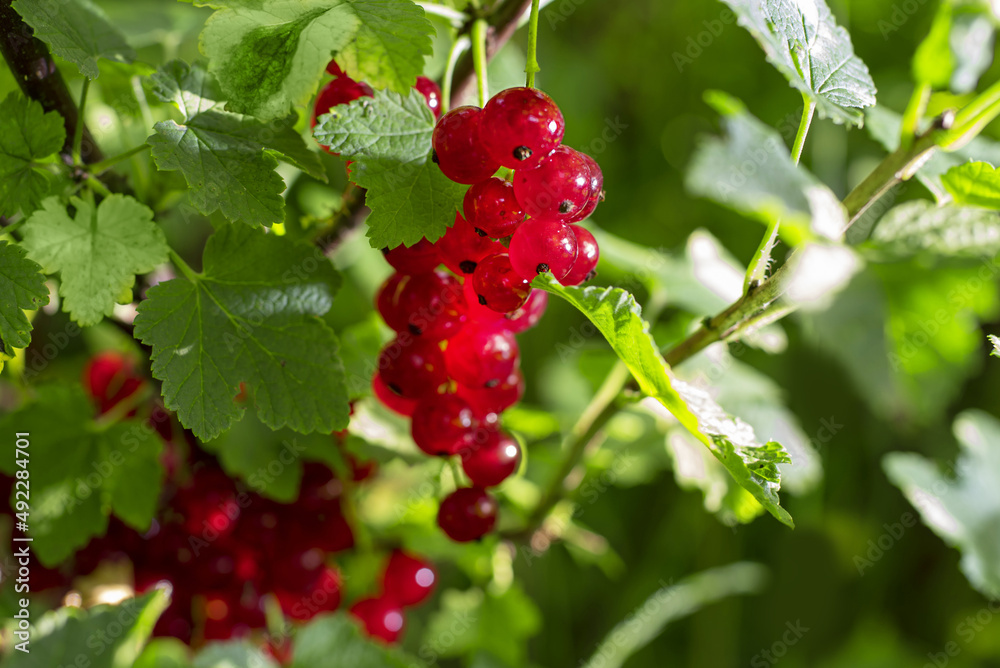 Redcurrant Harvest. Berries Red currants on a bush branch in the garden in summer. Selected focus, shallow depth of field