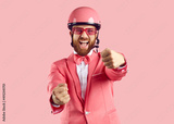 Happy driver holding invisible steering wheel. Studio shot of funny excited man with ginger beard, wearing pink helmet, funky suit, bow tie and glasses having fun and pretending to drive modern car
