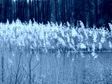 Przedwiośnie nad jeziorem. Słoneczny dzień. Suche, żółte kłosy wodnych traw kołyszą się na wietrze.