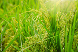 Selective focus on ear of rice. Green paddy field. Rice plantation. Organic rice farm in Asia. Rice price in the world market concept. Beautiful nature of farm land. Paddy field. Plant cultivation.