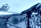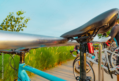 Bicycle parked on aluminium rack at the park. Outdoor exercise and recreation activity. Bicycle at bike parking station. Eco-friendly. Healthy lifestyle. Outdoor activity in summer. Extreme sport.
