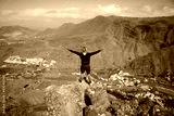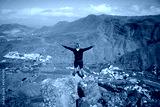 A young man with open arms in the peak of the mountains feeling the freedom