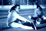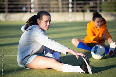 Portrait of young girls warming up before playing ball. Two beautiful girls in sportswear sitting on green field and stretching legs to start training. Healthy lifestyle and sport activity concept
