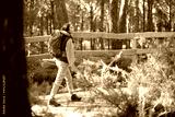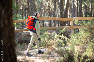 Side view of beautiful female hiker. Caucasian woman in casual clothes with dark hair and big backpack. Hobby, nature concept