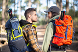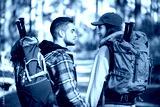 Side view of couple of young hikers. Caucasian man with beard and woman in cap with big backpacks. Hobby, nature, love concept