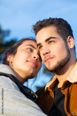 Bright image of couple of hikers in autumn. Man and woman in casual clothes. Nature, activity, hobby concept