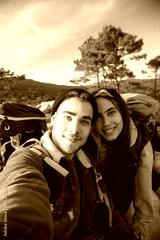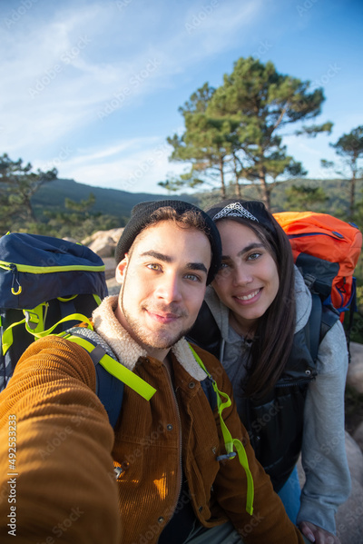 Pleased couple of hikers taking selfie. Man and woman in casual clothes and with backpacks looking at camera. Love, leisure, technology concept