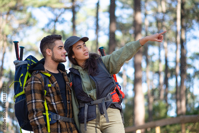 Concentrated couple of young hikers. Caucasian man with beard and woman in cap with big backpacks pointing, discussing route. Hobby, nature, love concept