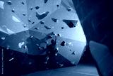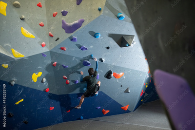 Back view of Caucasian sportsman climbing in gym. Young climber in sportswear training bouldering indoors starting climbing artificial wall with powdered hands.Health and modern sport activity concept