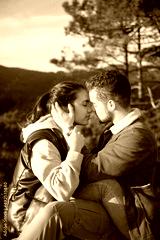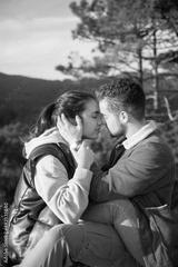 Gentle couple of hikers in autumn. Man and woman in casual clothes sitting at peak, touching with foreheads. Nature, activity, hobby concept