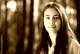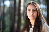 Portrait of elegant young woman in forest. Caucasian female woman with dark hair and green eyes looking at camera. Portrait, nature, beauty concept