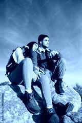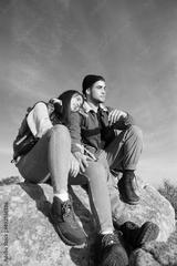Warm couple hiking in autumn. Man and woman sitting on peak, girlfriend leaning on shoulder. Love, leisure, relationship concept