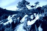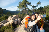 Merry couple of hikers taking selfie. Man and woman in casual clothes and with backpacks looking at mobile phone. Love, leisure, technology concept