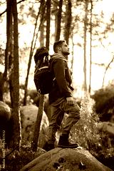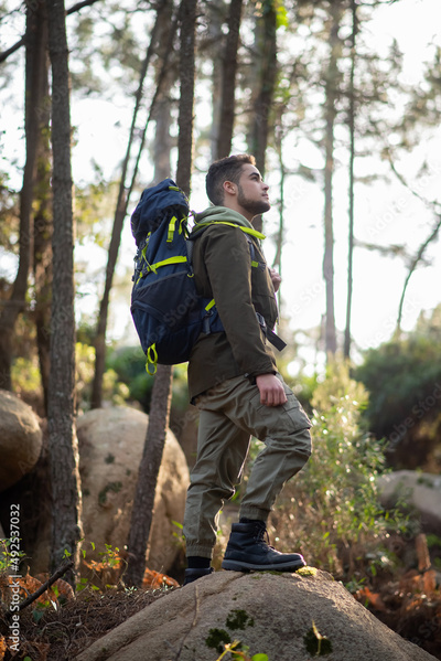 Determined male hiker in forest. Man with backpack with casual clothes standing on hill. Nature, leisure, hobby concept