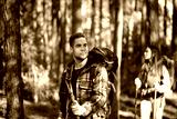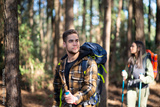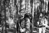 Active couple of young hikers. Caucasian man with beard and blurry woman with dark hair with big backpacks walking in forest. Hobby, nature, love concept